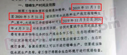 采暖季錯(cuò)峰生產(chǎn)分為兩階段2019年1月到3月15日24時(shí),時(shí)間75天,11月15日至12月,時(shí)間45天。