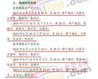 秋季錯(cuò)峰生產(chǎn)時(shí)間為兩個(gè)階段:2019年8月5日-8月24日,共20天,停產(chǎn)地區(qū):太原市、呂梁市、朔州市、臨汾市。2019年8月15日至9月3日,共20天,停產(chǎn)地區(qū):晉城市、陽泉市、晉中市、運(yùn)城市。2019年8月25日-9月13日,共20天,停產(chǎn)地區(qū):大同市、長治市、忻州市。