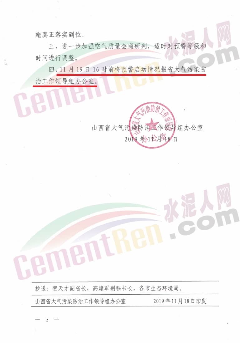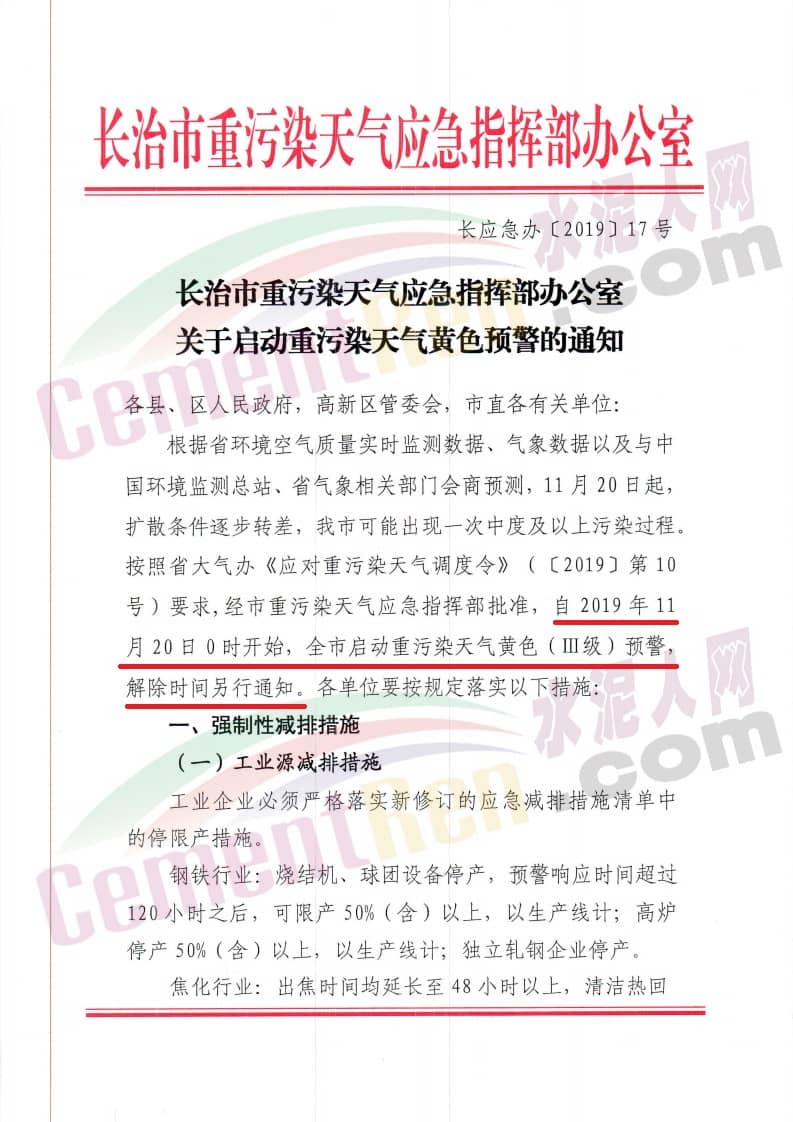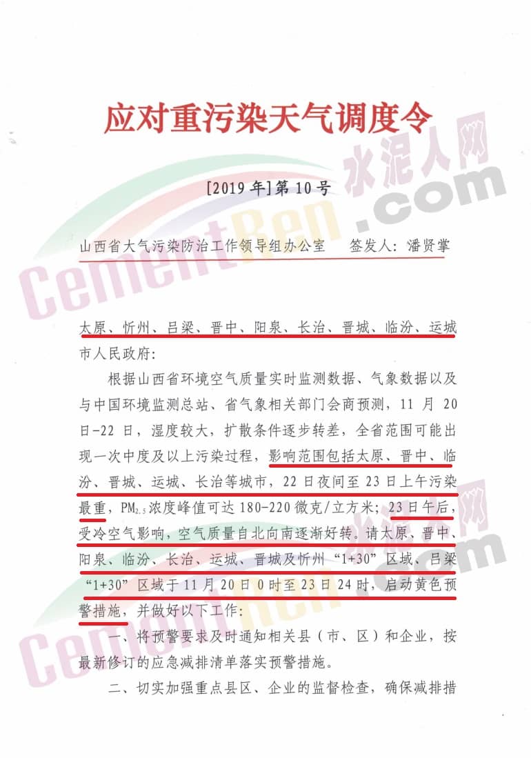 水泥人網(wǎng)消息:日前,山西省長治市、太原、忻州、晉中、陽泉、晉城、臨汾運城,河南省南陽、三門峽,河北省唐山市相繼發(fā)布了重污染天氣橙色預(yù)警(二級)響應(yīng)通知。