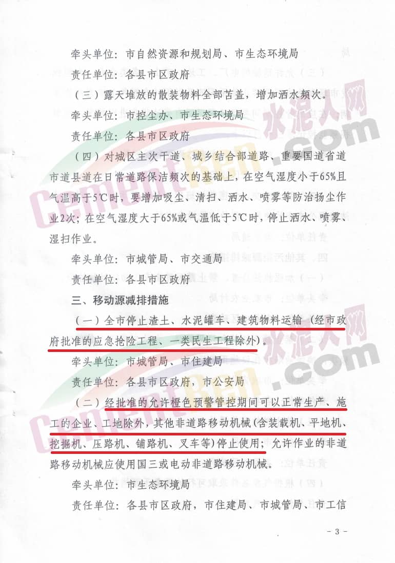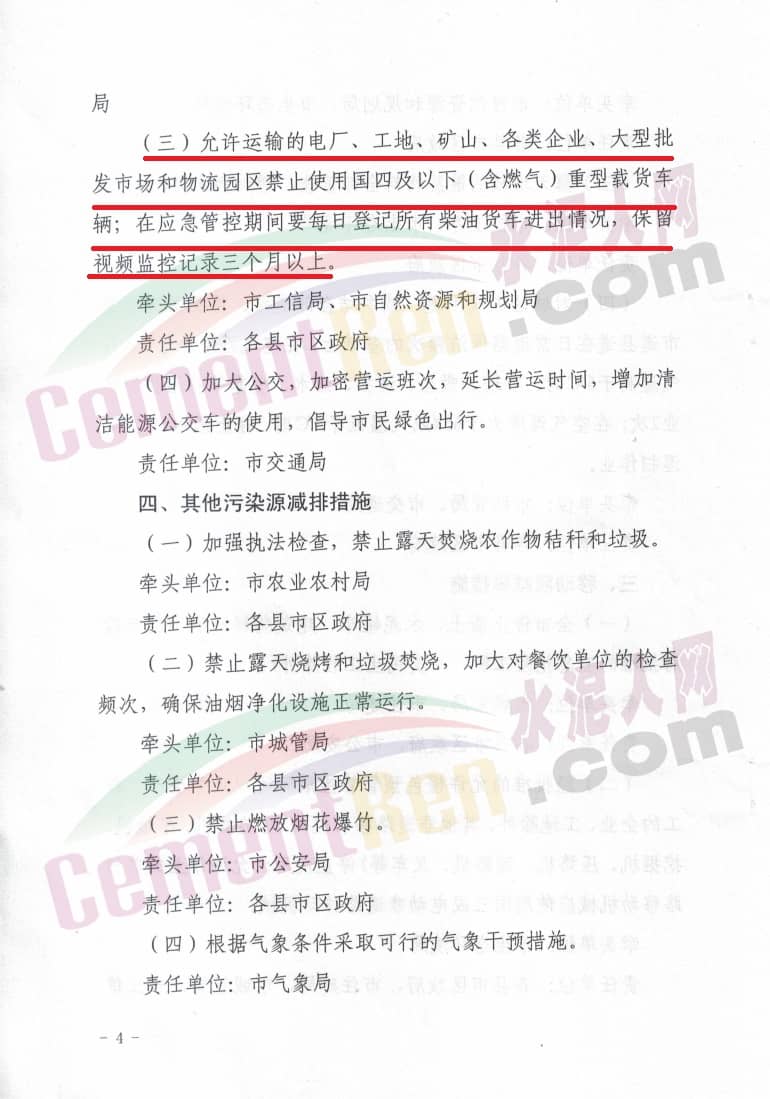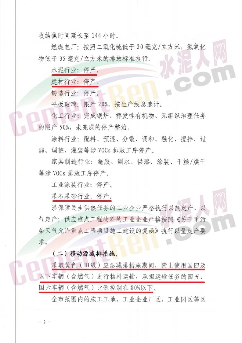 工業(yè)企業(yè)必須嚴(yán)格落實新修訂的應(yīng)急減排措施清單中停限產(chǎn)措施,建材行業(yè)全部停產(chǎn)(包括水泥行業(yè)、采石采砂行業(yè)等),涉保障民生供熱任務(wù)的工業(yè)企業(yè)嚴(yán)格執(zhí)行以熱定產(chǎn)、以氣定產(chǎn);供應(yīng)重點工程物流的工業(yè)企業(yè)嚴(yán)格按照《關(guān)于重污染天氣允許重點工程項目施工建設(shè)的復(fù)函》執(zhí)行以量定產(chǎn)要求。