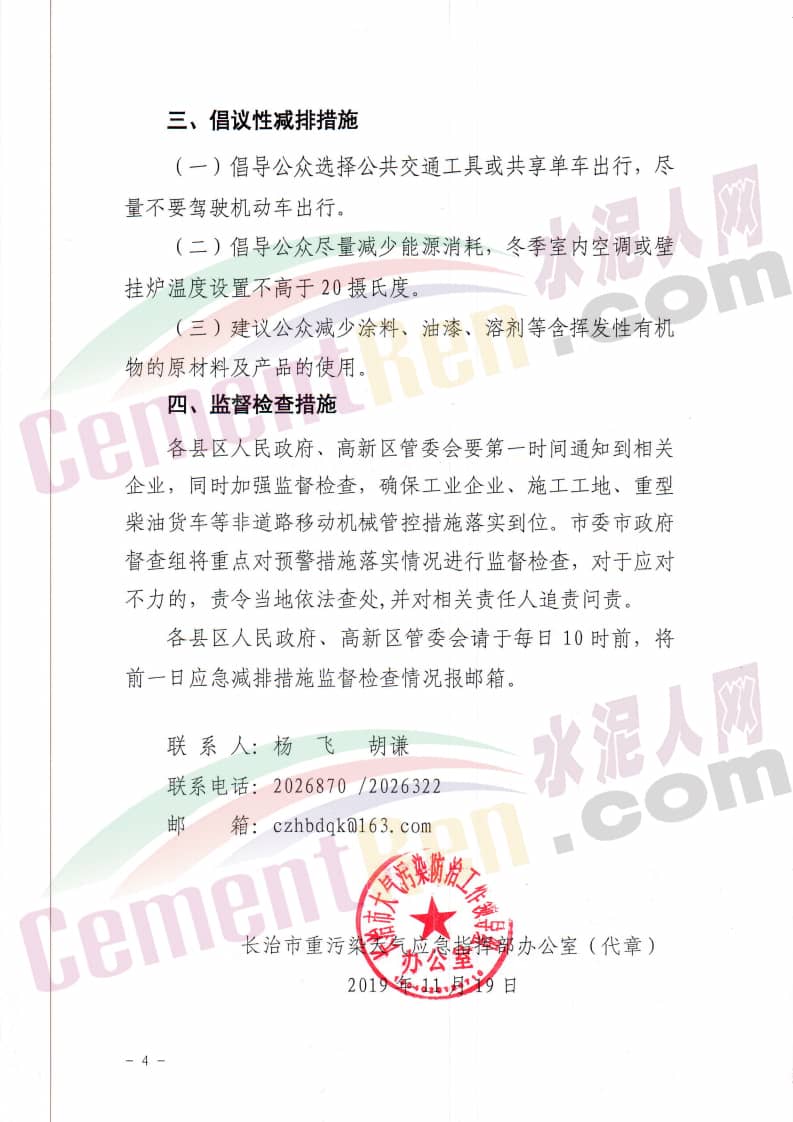 11月18日,山西省大氣污染防治工作領(lǐng)導(dǎo)組辦公室發(fā)布了《應(yīng)對重污染天氣調(diào)度令》稱,根據(jù)山西省環(huán)境空氣質(zhì)量實時監(jiān)測數(shù)據(jù)、氣象數(shù)據(jù)以及與中國環(huán)境監(jiān)測總結(jié)、省氣象相關(guān)部門會商預(yù)測,11月20日-22日,濕度較大,擴散條件逐步轉(zhuǎn)差,全省范圍可能出現(xiàn)一次中度及以上污染過程,影響范圍包括太原、晉中、臨汾、晉城、運城、長治等城市,22日夜間至23日上午污染最重,PM2.5濃度峰值可達180-220微克/立方米;23日午后、受冷空氣影響,空氣質(zhì)量自北向南逐漸好轉(zhuǎn),太原、晉中、臨汾、晉城、運城、長治及忻州“1+30”區(qū)域,呂梁“1+30”區(qū)域于11月20日0時至23日24時,啟動黃色已經(jīng)措施。應(yīng)急減排措施以長治市為例,減排措施如下: