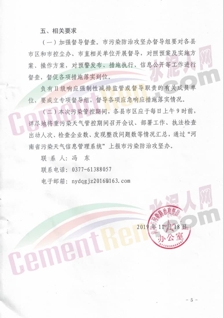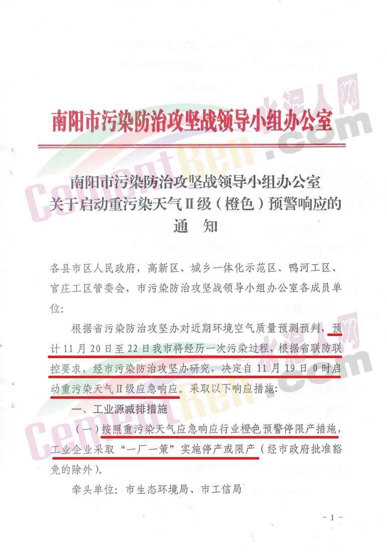 11月18日河南省南陽市相繼發(fā)布了《關(guān)于啟動重污染天氣二級(橙色)預(yù)警響應(yīng)的通知》稱根據(jù)省污染防治攻堅辦對近期的環(huán)境空氣質(zhì)量預(yù)測預(yù)判,預(yù)計11月20日至22日南陽市將經(jīng)理一次污染過程,根據(jù)省聯(lián)防控要求,經(jīng)市污染防控攻堅辦研究,決定自11月19日0時啟動重污染天氣二級應(yīng)急響應(yīng),具體減排措施如下: