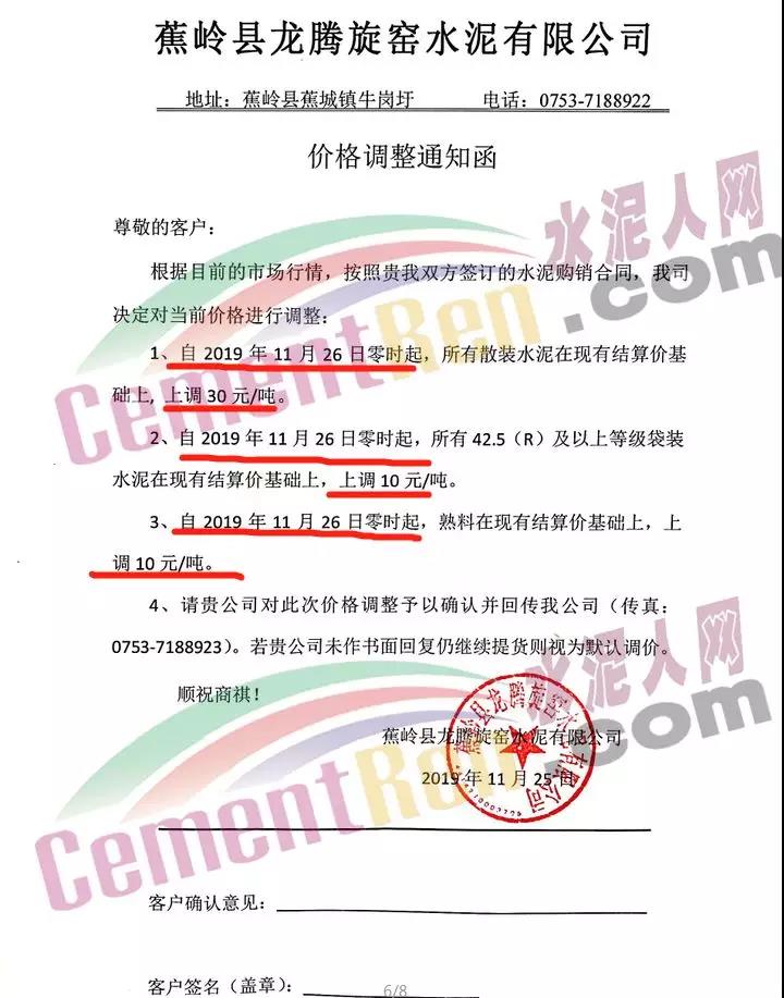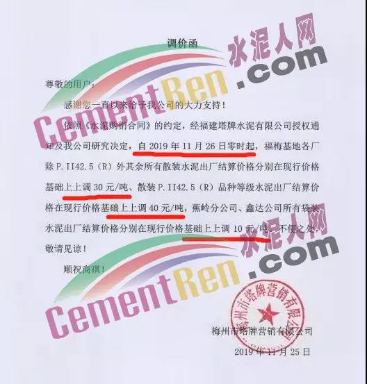 梅州市塔牌營銷有限公司發(fā)布了調(diào)價函稱,依照《水泥購銷合同》的約定,決定自2019年11月26日零時起,福梅基地各廠除P.II42.5(R)外其余所有散裝水泥出廠結(jié)算價格在現(xiàn)行價格基礎(chǔ)上上調(diào)30元/噸,散裝P.II42.5(R)品種等級水泥出廠結(jié)算價格在現(xiàn)行價格基礎(chǔ)上上調(diào)40元/噸,蕉嶺分公司、鑫達分公司所有袋裝水泥出廠結(jié)算價格分別在現(xiàn)行價格基礎(chǔ)上上調(diào)10元/噸。
