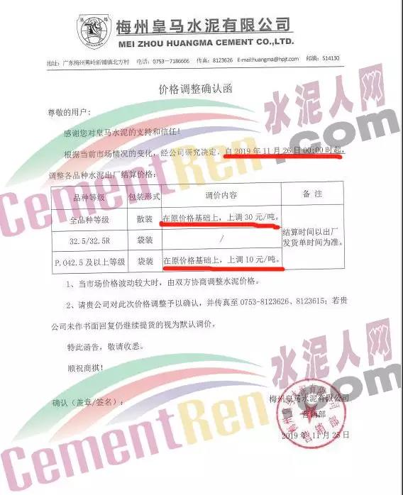 梅州市皇馬水泥有限公司發(fā)布了價格調(diào)整確認函,根據(jù)當(dāng)前市場情況變化,決定自2019年11月26日00:00時起,全品種等級散裝在原價基礎(chǔ)上,上調(diào)30元/噸,P.O42.5及以上等級袋裝在原價格基礎(chǔ)上,上調(diào)10元/噸。