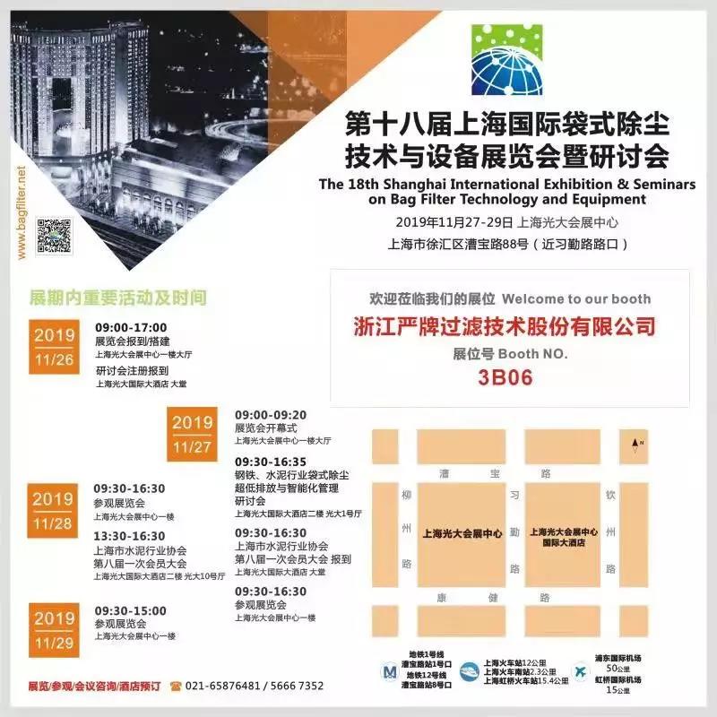 ▲嚴牌成為“垃圾焚燒技術(shù)與裝備國家工程實驗室”成員單位 據(jù)水泥人網(wǎng)了解,在不斷加強技術(shù)研發(fā)水平的提升,企業(yè)的技術(shù)研發(fā)實力已經(jīng)達到了國內(nèi)先進水平,嚴牌股份也先后被認定為國家高新技術(shù)企業(yè),浙江省企業(yè)技術(shù)中心、浙江省創(chuàng)新型示范中小企業(yè),浙江省“隱形冠軍”企業(yè),浙江省管理創(chuàng)新試點企業(yè),浙江省清潔生產(chǎn)階段性成果企業(yè),浙江省高新技術(shù)企業(yè)研究開發(fā)中心,浙江工業(yè)名牌產(chǎn)品等。延伸閱讀: 11月27日-29日,嚴牌股份將參與“第十八屆上海國際袋式除塵技術(shù)與裝備展覽會”,誠邀您蒞臨現(xiàn)場參觀指導(dǎo)!展位號:3B06展會地點:上海光大會展中心(參展信息見下圖)
