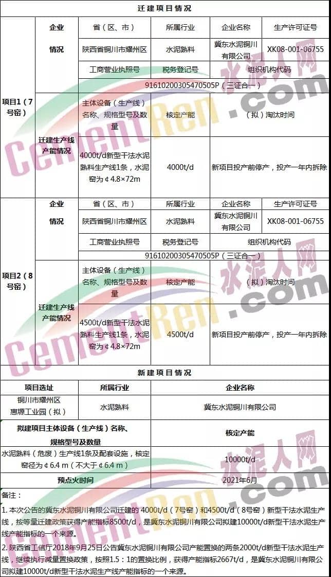 經(jīng)審核,冀東水泥銅川有限公司4000t/d新型干法熟料水泥生產(chǎn)線和4500t/d新型干法熟料水泥生產(chǎn)線符合“因當(dāng)?shù)匕l(fā)展規(guī)劃調(diào)整,導(dǎo)致不屬于國家明令淘汰的落后產(chǎn)能的生產(chǎn)裝置遷建的,且企業(yè)持有的生產(chǎn)許可證仍在有效期內(nèi),企業(yè)搬遷又未享受退出產(chǎn)能的資金獎補(bǔ)和政策支持,企業(yè)承諾確不新增產(chǎn)能”要求。公示原文如下: