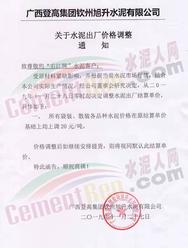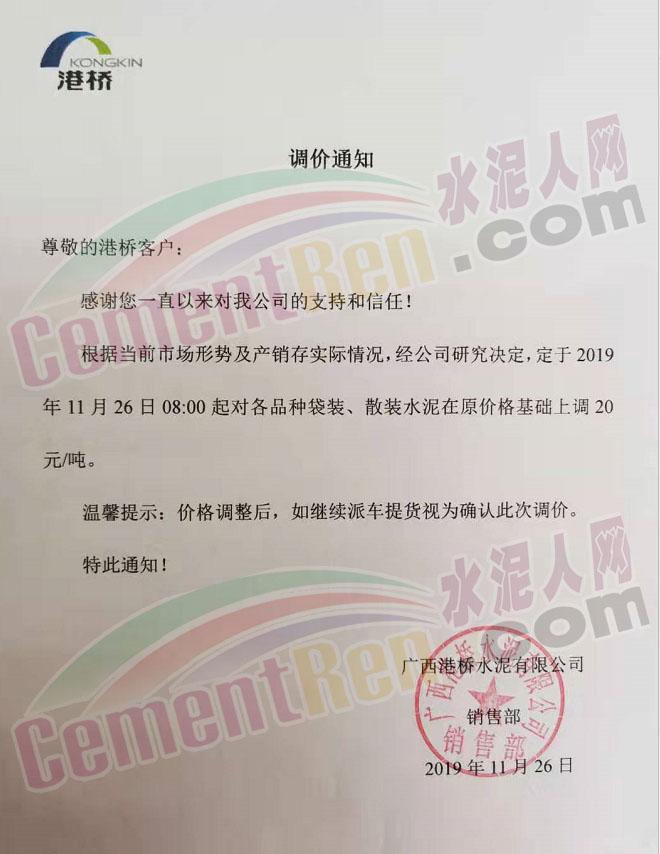 水泥價(jià)格方面,11月9日廣西區(qū)域華潤、南方、臺(tái)泥等多家主導(dǎo)通知,水泥、熟料統(tǒng)一上調(diào)20-30元/噸。同期,廣東區(qū)域華潤水泥、塔牌水泥、中材水泥、臺(tái)泥水泥、惠州光大水泥等眾多企業(yè)也紛紛宣布上調(diào)水泥價(jià)格,漲幅在10-20元/噸。截止目前 ,廣東珠三角區(qū)域自11月初至今已經(jīng)經(jīng)歷了三輪價(jià)格上調(diào),漲價(jià)近100元/噸,截止28日,主流品牌PO42.5散散裝水泥出廠報(bào)價(jià)515元/噸。