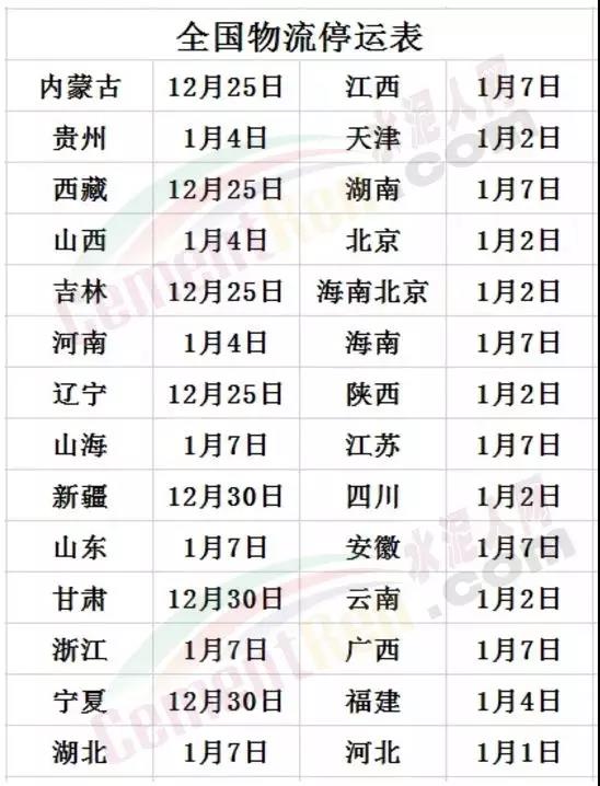 黑龍江處于冬季較寒冬地區(qū),每到冬季水泥企業(yè)發(fā)運(yùn)部門(mén)都會(huì)調(diào)整發(fā)運(yùn)時(shí)間,上年曾經(jīng)有過(guò)隔日發(fā)運(yùn)或夜間停發(fā)的通知。而每到年底物流行業(yè)都會(huì)通知調(diào)整發(fā)運(yùn)時(shí)間和停運(yùn)時(shí)間,今年也不例外。相比2019年,2020年的春節(jié)提早了11天。伴隨春節(jié)的提前,物流也將提前停運(yùn)。據(jù)往年慣例,一般物流提前15-20天停運(yùn)放假,這也意味著明年1月份僅一周左右的時(shí)間正常發(fā)貨,接下來(lái)的12月份將成為經(jīng)銷(xiāo)商備貨的高峰期。2020年的春節(jié),受消費(fèi)壓抑、品牌價(jià)格戰(zhàn)等因素影響,還將迎來(lái)一波搶購(gòu)熱潮。對(duì)于經(jīng)銷(xiāo)商而言,今年的備貨黃金周期在12月份。距離春節(jié)備貨不足20天,趁著還有時(shí)間,加緊備貨。近日,物流部門(mén)發(fā)布了河北、山東、江蘇、湖北、湖南、上海、安徽、內(nèi)蒙古等27個(gè)省份地區(qū)春節(jié)期間物流停運(yùn)通知。全國(guó)物流停運(yùn)通知,從12月25日起就陸續(xù)停運(yùn)了。時(shí)至年底,隨著天氣寒冷和最近霧霾天氣嚴(yán)重,物流部發(fā)出聲明,全國(guó)物流停運(yùn)時(shí)間已經(jīng)確定:內(nèi)蒙古、西藏、吉林、遼寧等地12月25日停運(yùn);新疆、甘肅、寧夏等地12月30日停運(yùn);河北1月1日停運(yùn);天津、北京、陜西、四川、云南等地1月2日停運(yùn);福建、貴州、山西、河南等地1月4日停運(yùn);上海、山東、浙江、湖北、江西、湖南、海南、江蘇、安徽、廣西等地1月7日停運(yùn)。