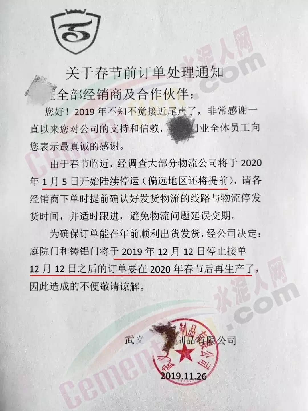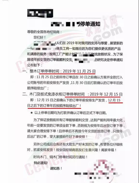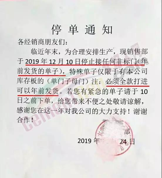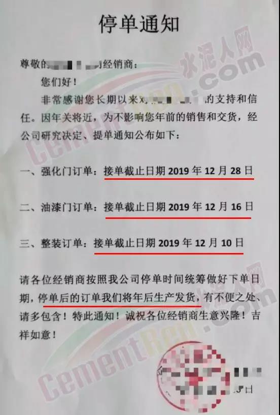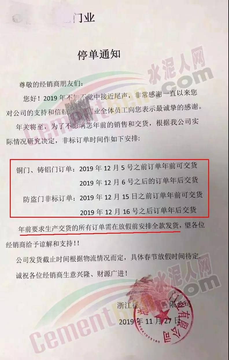 某企業(yè)停單通知接單截止日期為12月10日~28日,并表示停單后的訂單將在年后生產(chǎn)發(fā)貨。各企業(yè)停止接單通知多有明確年前要求生產(chǎn)交貨的所有訂單需在放假前安排全款發(fā)貨。