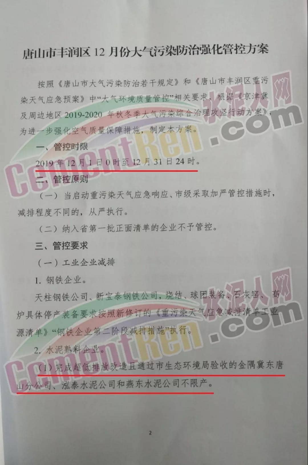 (1) 完成超低排放改造且通過市生態(tài)環(huán)境局驗收的金隅冀東唐山分公司、金隅冀東灤州公司,啟新水泥、三友水泥,泓泰泥和燕東水泥不限產。