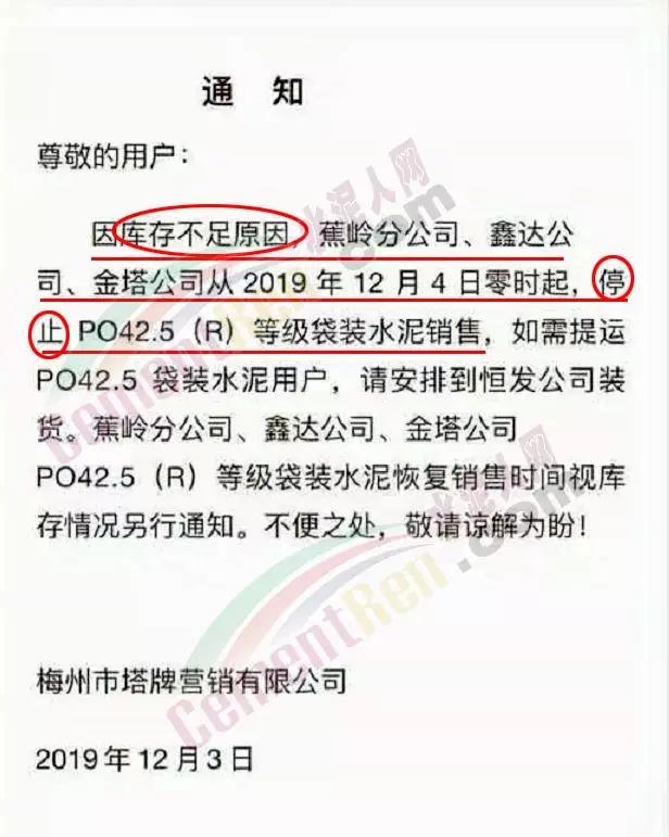 昨日(12月3日),梅州市塔牌營銷有限公司發(fā)布通知稱,因庫存不足原因,焦嶺分公司、鑫達(dá)公司、金塔公司從今日(12月4日)零時起停止PO42.5(R)等級袋裝水泥銷售,如需提運PO42.5(R)袋裝水泥用戶,請安排到恒發(fā)公司裝貨。焦嶺分公司、鑫達(dá)公司、金塔公司PO42.5(R)袋裝水泥恢復(fù)銷售時間視庫存情況另行通知。