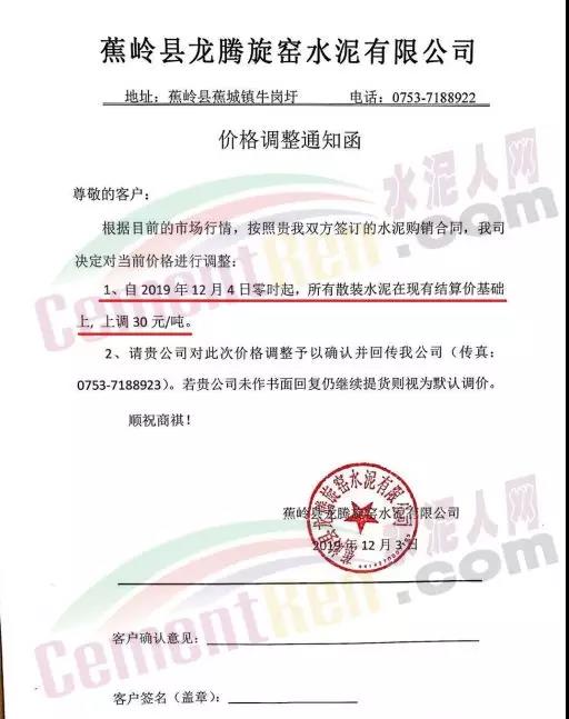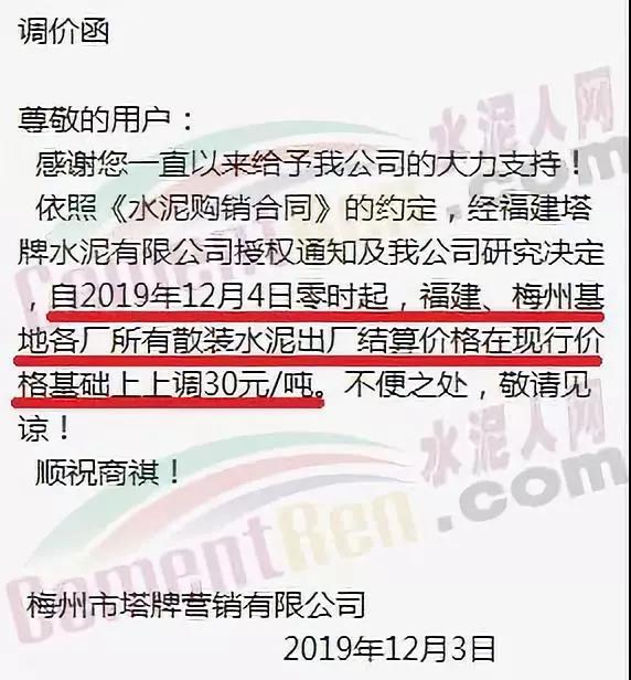 同期,梅州市塔牌營銷有限公司還發(fā)調(diào)價函稱自2019年12月4日零時起,福建、梅州基地各廠所有散裝水泥出廠結(jié)算價格在現(xiàn)行價格基礎(chǔ)上上調(diào)30元/噸。