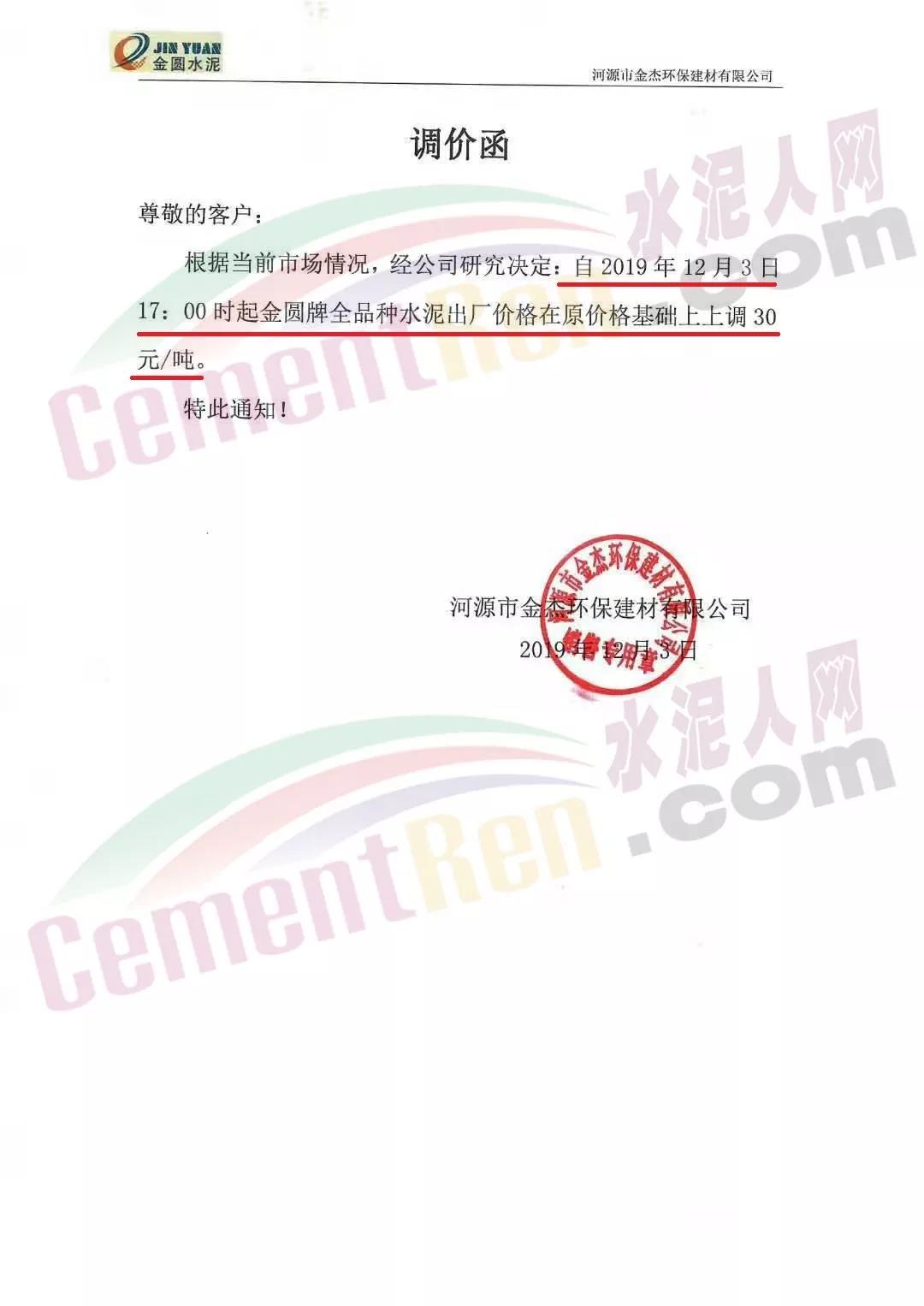 河源市金杰環(huán)保建材有限公司12月3日發(fā)布了調(diào)價函稱,根據(jù)當(dāng)前市場情況,經(jīng)公司研究決定,自2019年12月3日17:00時起金圓牌全品種水泥出廠價格在原基礎(chǔ)上上調(diào)30元/噸。