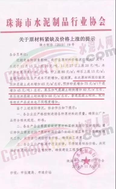 據(jù)了解,11月29日珠海市水泥制品行業(yè)協(xié)會曾發(fā)布調(diào)價通知稱,近期受各種因素影響,行業(yè)內(nèi)原材料波動較大。其中,水泥與11月15日上漲20元/噸、11月27日上漲20元/噸,本月兩次漲價累計40元/噸;砂上漲80元/m³;碎石上漲15元/m³。