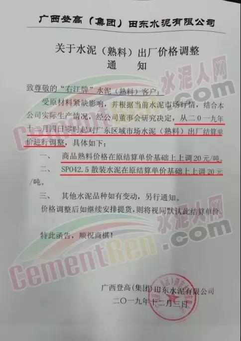 廣西登高(集團(tuán))田東水泥有限公司也發(fā)布調(diào)價通知稱,收原材料緊缺影響,并根據(jù)當(dāng)前水泥市場行情,結(jié)合實際生產(chǎn)情況,經(jīng)董事會研究決定,從2019年12月4日0時起對廣東區(qū)域市場(熟料)進(jìn)行調(diào)整,商品熟料價格在原結(jié)算單價基礎(chǔ)上上調(diào)20元/噸,SP042.5散裝水泥在原結(jié)算單價基礎(chǔ)上上調(diào)20元/噸,其他水泥品種如有變動,另行通知。