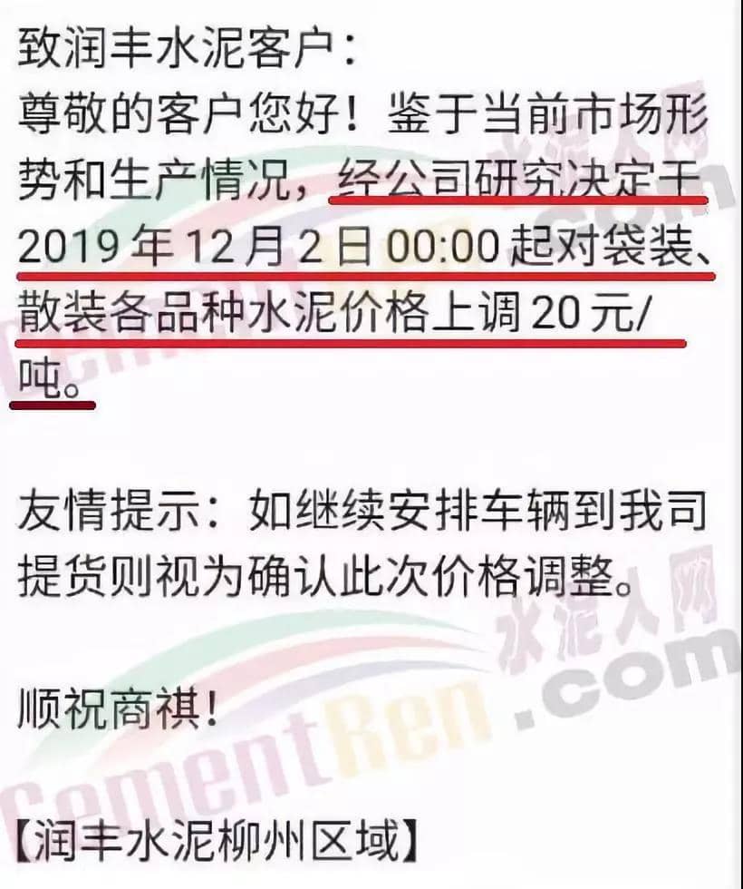 根據(jù)當(dāng)前市場形勢及產(chǎn)銷存實際情況,經(jīng)公司研究決定,定于2019年12月3日00:00起對袋裝、散裝各品種水泥價格上調(diào)20元/噸。
