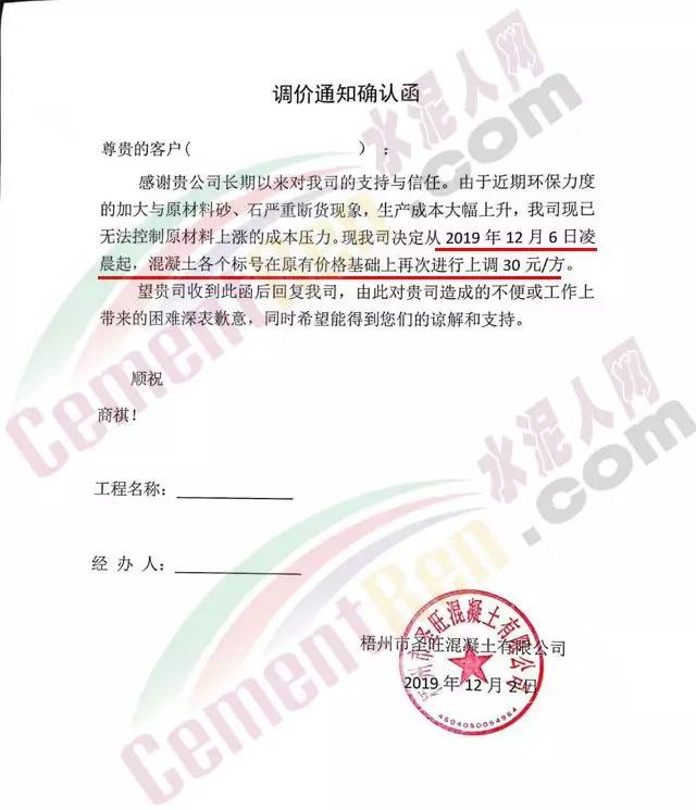 12月2日梧州市圣旺混凝土有限公司調(diào)價通知稱由于近期環(huán)保力度的加大與原材料砂、石嚴(yán)重斷貨,生產(chǎn)成本大幅上升,公司已無法控制原材料上漲的成本壓力。經(jīng)公司研究決定 自12月6日凌晨起,混凝土各標(biāo)號在原有價格上再次進(jìn)行上調(diào)30元/方。