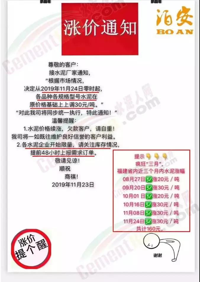 11月23日,福建泊安水泥的漲價通知稱,根據(jù)市情況從11月24日零時起,各品種各規(guī)格水泥在原價格基礎上上調30元/噸。自此,福建省內(nèi)近三個月內(nèi)水水泥水泥連漲六波,累計漲價達160元/噸。