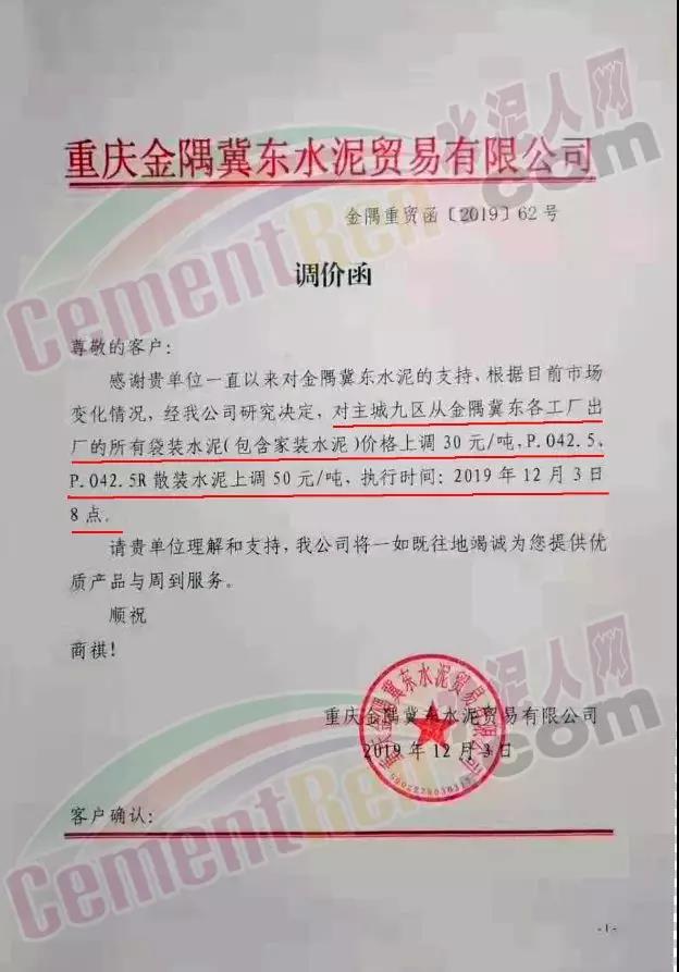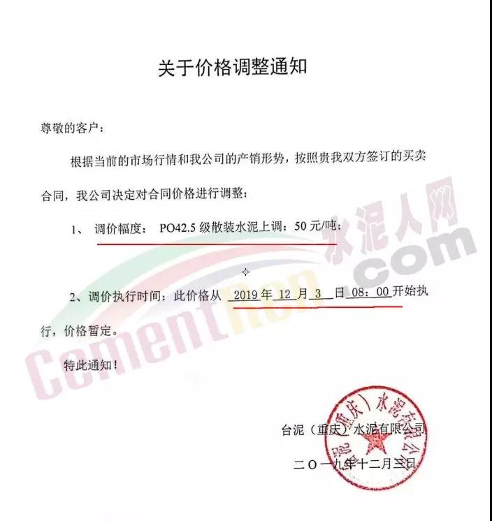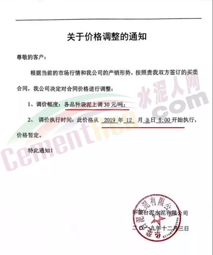 近期,因市場原因,經(jīng)研究決定,自2019年12月5日零時起,發(fā)往貴公司區(qū)域的各品種散、袋水泥在原有價格基礎上上調30元/噸;