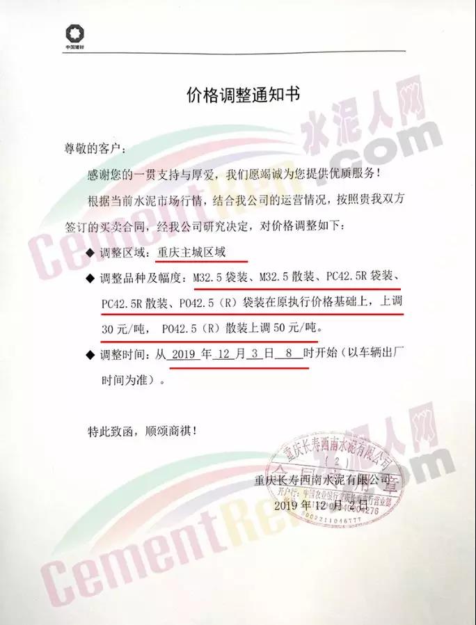 重慶長壽西南水泥調價通知書稱,根據(jù)當前水泥市場行情,結合公司運營情況,經(jīng)公司研究決定自12月3日時對重慶主城區(qū)M32.5袋/散,PC42.5R袋/散、PO42.5(R)袋裝在原執(zhí)行價格基礎上上調30元/噸,PO42.5(R)散裝上調50元/噸。
