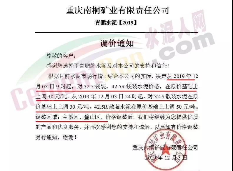 根據(jù)目前市場行情,經(jīng)公司研究決定,自2019年12月5日零時起我司發(fā)往各區(qū)域水泥出廠單價在原有基礎上上調30元/噸。