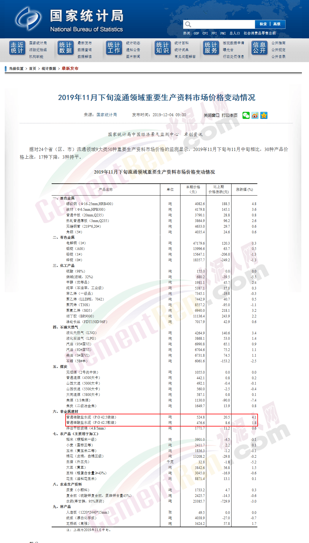 國家統(tǒng)計(jì)局近期對24個省(區(qū)、市)流通領(lǐng)域9大類50種重要生產(chǎn)資料市場價格的監(jiān)測數(shù)據(jù)顯示,2019年11月下旬與11月中旬相比,30種產(chǎn)品價格上漲,17種下降,3種持平。其中非金屬建材普通硅酸鹽水泥(P.O 42.5袋裝)均價524.8元/噸,較上期上漲20.5元/噸,漲幅4.1%;普通硅酸鹽水泥(P.O 42.5散裝)均價476.6元/噸,較上期上漲8.6元/噸,漲幅1.8%。這個價格已超過2018年的最高點(diǎn),創(chuàng)2011年以來的最高價。