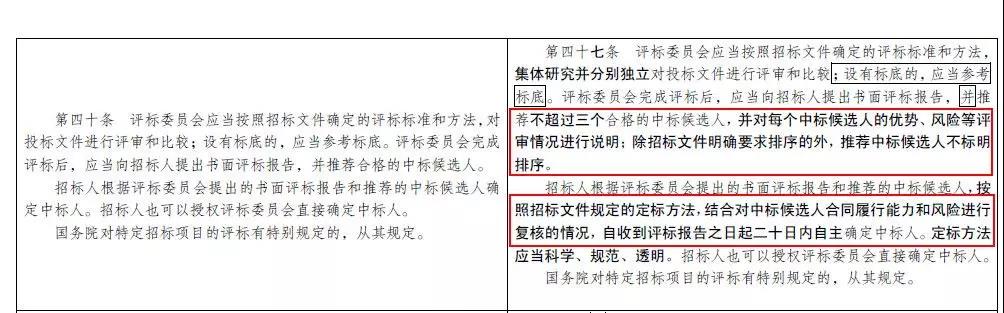 在意見(jiàn)稿中,對(duì)原招投標(biāo)法第四十條的修改格外引人注目。修改之后,評(píng)標(biāo)委員會(huì)推薦的中標(biāo)候選人不標(biāo)明排序;招標(biāo)人按照招標(biāo)文件規(guī)定的定標(biāo)方法,結(jié)合中標(biāo)候選人合同履行能力和風(fēng)險(xiǎn)進(jìn)行復(fù)核的情況,自收到為評(píng)標(biāo)報(bào)告之日起二十日內(nèi)自主確定中標(biāo)人。
