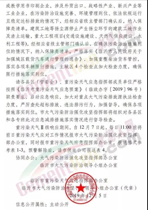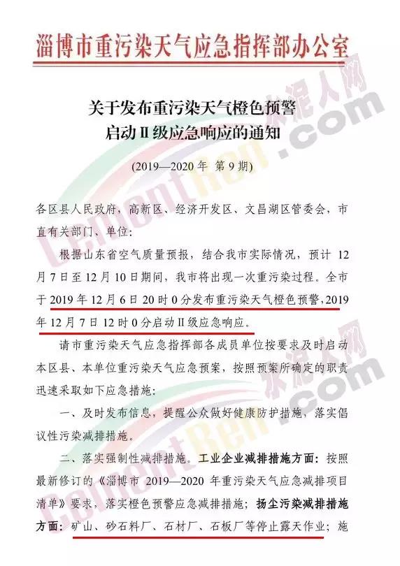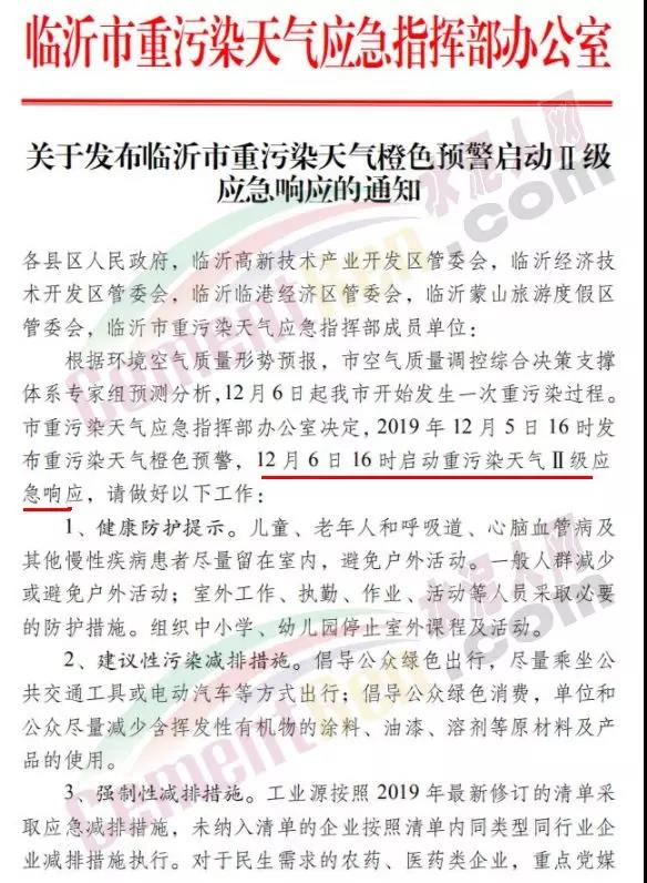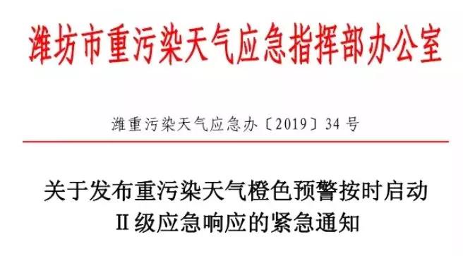 12月5日,山東省濰坊市重污染天氣應(yīng)急指揮部辦公室發(fā)布《關(guān)于發(fā)布重污染天氣橙色預(yù)警按時啟動Ⅱ級應(yīng)急響應(yīng)的緊急通知》稱:濰坊市自2019年12月5日12時發(fā)布重污染天氣橙色預(yù)警,12月6日12時啟動Ⅱ級應(yīng)急響應(yīng)。