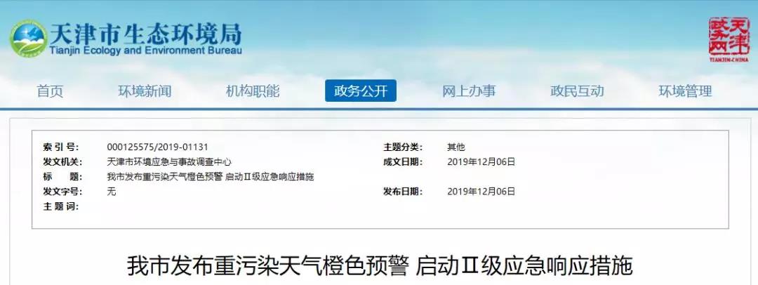 根據(jù)我市空氣質(zhì)量預(yù)測和會商結(jié)果,受不利氣象條件影響,2019年12月7日下午起我市將出現(xiàn)重度污染過程,符合《天津市重污染天氣應(yīng)急預(yù)案》(津政辦發(fā)〔2019〕40號)規(guī)定的重污染天氣橙色預(yù)警條件。經(jīng)市人民政府批準,現(xiàn)發(fā)布重污染天氣橙色預(yù)警,從12月7日14時起啟動Ⅱ級(橙色)應(yīng)急響應(yīng)。一、強制性減排措施1.工業(yè)企業(yè)按照重污染天氣應(yīng)急減排清單,嚴格落實相應(yīng)的應(yīng)急減排措施。2.停止室外建筑拆除、噴涂、粉刷、切割、護坡噴漿作業(yè)。3.除涉及重大民生工程、安全生產(chǎn)及應(yīng)急搶險任務(wù)外,停止所有施工工地的土石方作業(yè)(包括停止土石方開挖、回填、場內(nèi)倒運、摻拌石灰、混凝土剔鑿等作業(yè),停止建筑工程配套道路和管溝開挖作業(yè))。4.未安裝密閉裝置的煤炭、建筑垃圾、渣土、砂石料等運輸車輛禁止上路行駛。5.除涉及重大民生工程、安全生產(chǎn)及應(yīng)急搶險任務(wù)外,施工工地、工業(yè)企業(yè)廠區(qū)和工業(yè)園區(qū)內(nèi),停止使用國家第二階段及以下非道路移動機械(清潔能源和緊急檢修作業(yè)機械除外)。6.除涉及重大民生工程、安全生產(chǎn)及應(yīng)急搶險任務(wù)外,所有水泥粉磨站、渣土存放點全面停止生產(chǎn)、運行;全市混凝土攪拌站和砂漿攪拌站停止生產(chǎn),嚴格落實封閉、苫蓋等降塵措施,并增加灑水降塵頻次。7.各區(qū)采取科學(xué)措施,根據(jù)空氣溫度及相對濕度,對轄區(qū)內(nèi)主要道路適時調(diào)整濕法作業(yè)頻次,降低濕法作業(yè)頻次時應(yīng)適當加大吸掃作業(yè)力度。8.本市及外埠中型重型載貨汽車在本市行政區(qū)域內(nèi)道路(高速公路除外)全天按車牌尾號單雙號行駛(保證安全生產(chǎn)運行,運輸民生保障物資或特殊需求產(chǎn)品,承擔急救、搶險等任務(wù),掛新能源牌照及本市未更換新能源牌照的新能源汽車除外)。本市及外埠中型重型載貨汽車在外環(huán)線以內(nèi)道路的日常車牌尾號限行措施暫停執(zhí)行,其他限行措施繼續(xù)執(zhí)行。9.港口集疏運機動車進出港區(qū)全天按車牌尾號單雙號行駛(保證安全生產(chǎn)運行,運輸民生保障物資或特殊需求產(chǎn)品,以及為外貿(mào)貨物、進出境旅客提供港口集疏運服務(wù)的,掛新能源牌照及本市未更換新能源牌照的新能源汽車除外)。10.港口、物流(除民生保障類)等涉及大宗物料和產(chǎn)品運輸(日常車輛進出量超過10輛次)的單位停止使用國家第四階段及以下重型載貨汽車(含燃氣)進行運輸(特種車輛、危化品車輛等除外)。