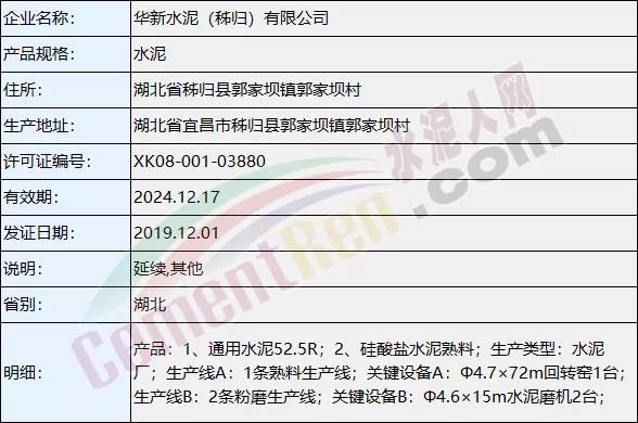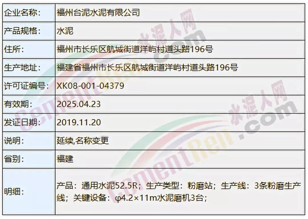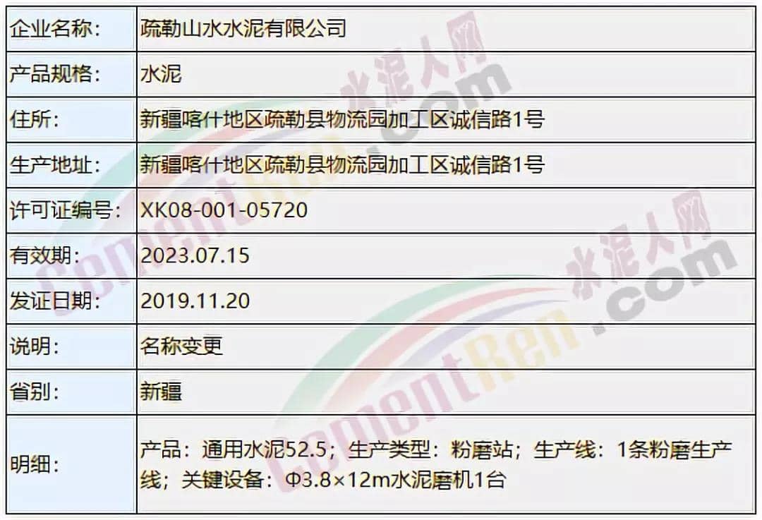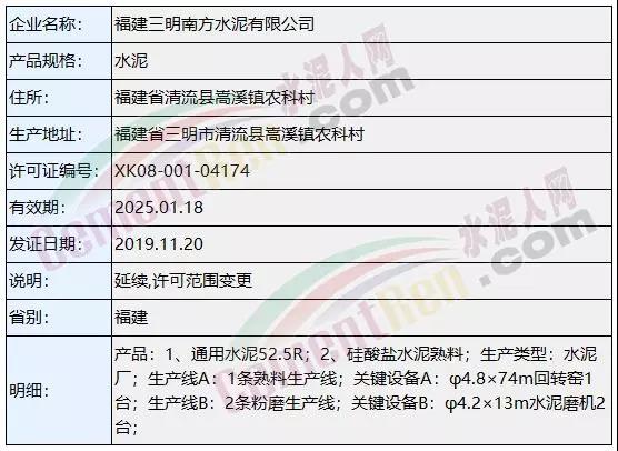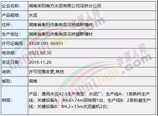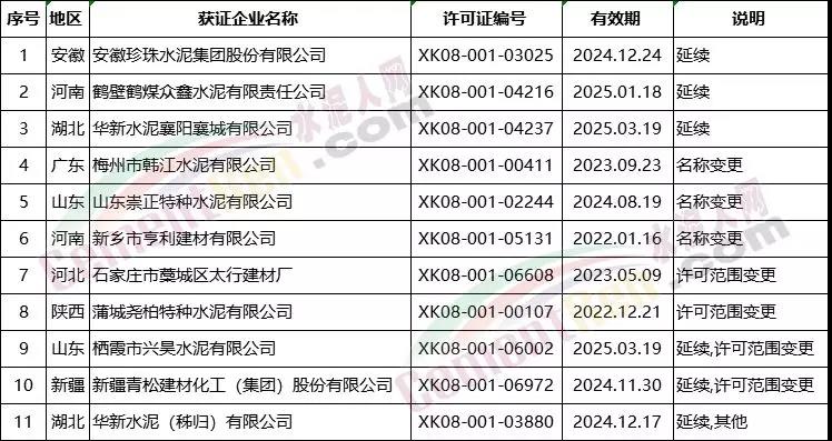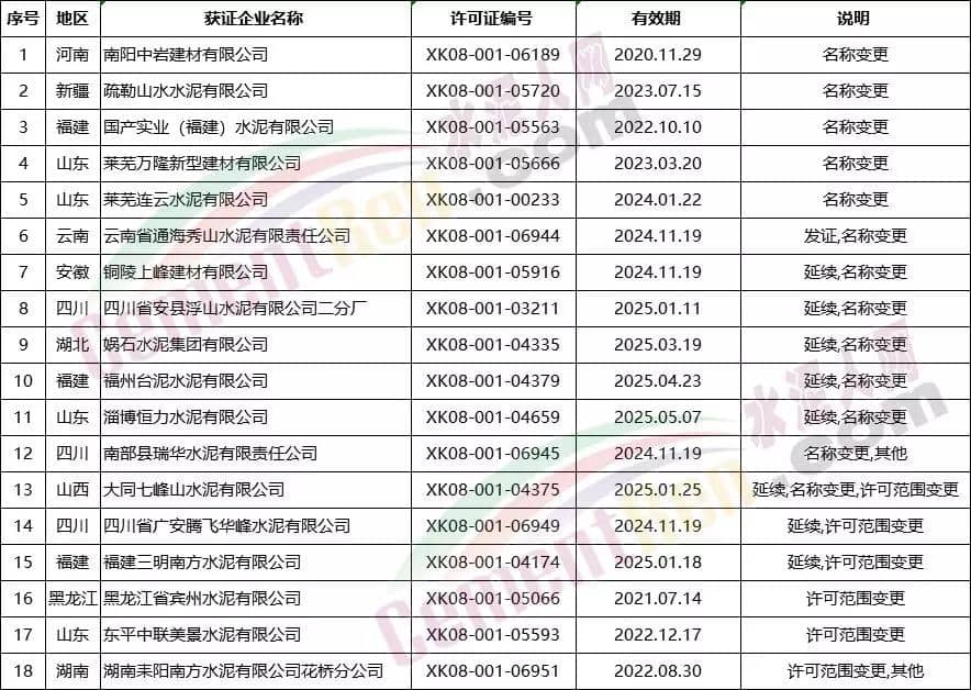 上個月(11月)涉及名稱變更,許可范圍變更的共18個編號 ,其中包括新疆疏勒山水水泥有限公司、福州臺泥水泥有限公司名稱變更。以及福建三明南方水泥有限公司及湖南耒陽南方水泥有限公司花橋分公司許可范圍變更。