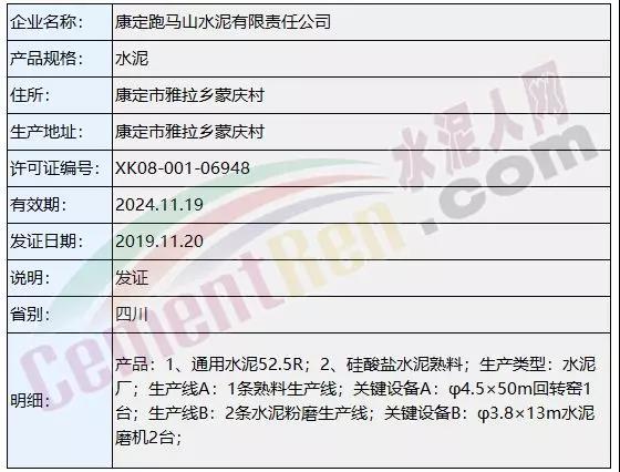 據(jù)了解,市場監(jiān)管總局全國工業(yè)產(chǎn)品生產(chǎn)許可證辦公室上個月共發(fā)放48個編號生產(chǎn)許可證,其中新發(fā)證書三個編號涉及兩家全能水泥廠和一家粉磨站。其中康定跑馬山水泥有限責(zé)任公司2500t/d熟料新型干法水泥生產(chǎn)線為今年 2019年4月下旬新點火生產(chǎn)線。涉及名稱變更及許可范圍變更的共18個編號。到期延續(xù)的共27個編號,發(fā)證日期均為2019年11月20日。