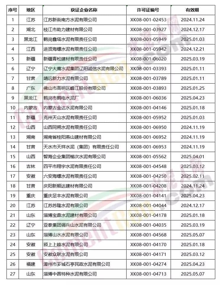 上個月到期延續(xù)共27個編號,其中包括海螺水泥、南方水泥、亞泰集團(tuán)、山水水泥、上峰水泥旗下水泥企業(yè)。