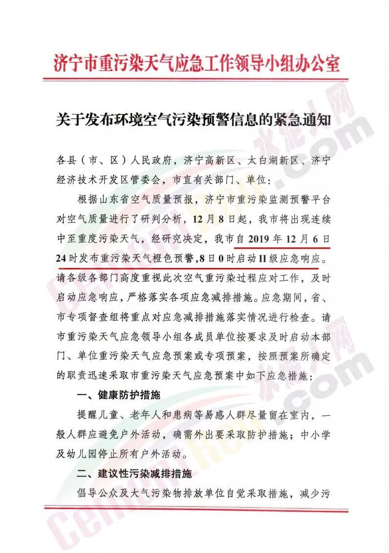其中,濟(jì)寧市《關(guān)于發(fā)布環(huán)境空氣污染預(yù)警信息的緊急通知》稱,自12月6日24時(shí)發(fā)布重污染天氣橙色預(yù)警,8日0時(shí)啟動(dòng)II級(jí)應(yīng)急響應(yīng)。