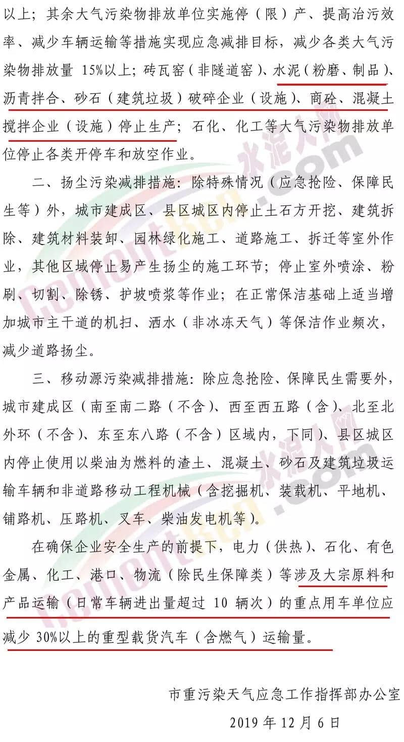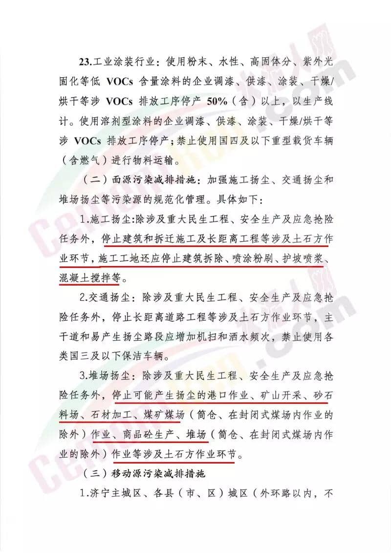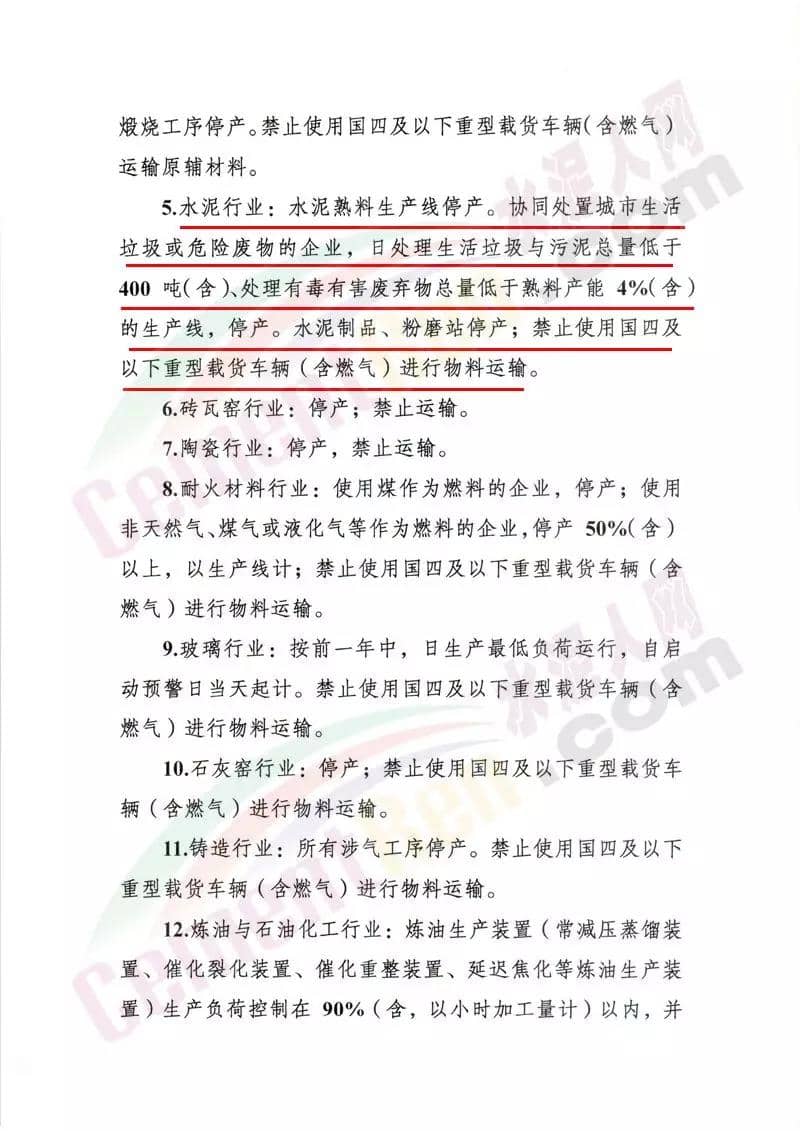 強(qiáng)制性污染減排措施要求水泥行業(yè)水泥熟料生產(chǎn)線停產(chǎn)。協(xié)同處置城市生活垃圾或危廢的企業(yè),日處理生活垃圾與污泥總量低于400噸(含 )、處置有毒有害廢棄物總量低于熟料產(chǎn)能4%(含)的生產(chǎn)線停產(chǎn)。水泥制品、粉磨站停產(chǎn);禁止使用國(guó)四及以下重型載貨車輛(含燃?xì)?進(jìn)行物料運(yùn)輸。