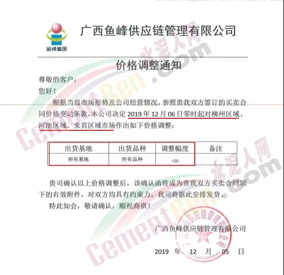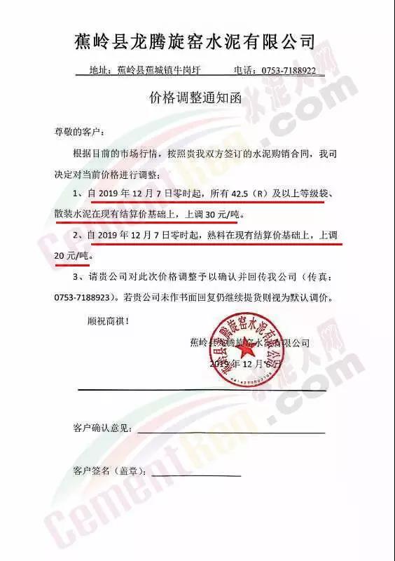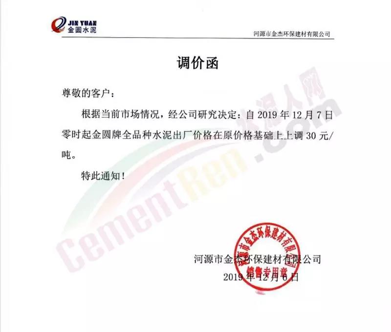 河源市金杰環(huán)保建材有限公司調(diào)價函稱,自12月7日零時起金圓牌全品牌水泥出廠價在原價基礎(chǔ)上漲30元/噸。