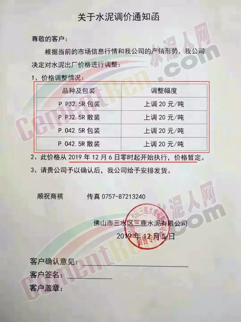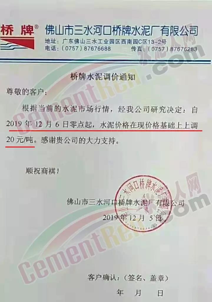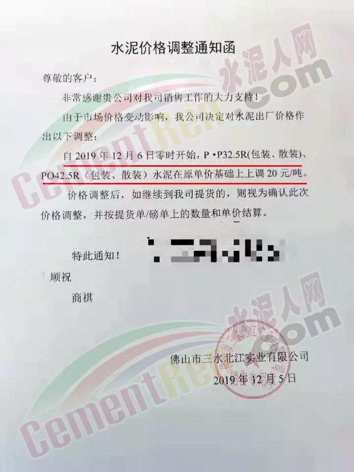 廣東佛山市多家水泥企業(yè)通知自12月有6日起上調(diào)水泥價格,各標(biāo)號水泥上調(diào)20元/噸。
