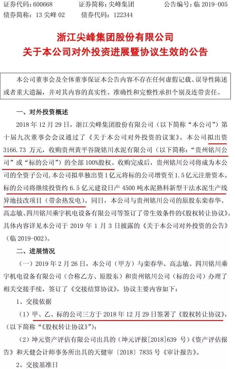 據了解,這條生產線是浙江尖峰集團股份有限公司出資3166.73萬元收購的貴州黃平谷隴銘川水泥有限公司(貴州銘川公司)。收購完成后,貴州銘川公司成為尖峰的全資子公司,并由尖峰擬單獨出資1億元將其注冊資本增資至1.5億元,又投資約6.5億元建設日產4500噸水泥熟料新型干法水泥生產線異地技改項目(帶余熱發(fā)電)。今年2月28日,浙江尖峰集團股份有限公司《關于本公司對外投資進展暨協(xié)議生效的公告》中披露了該收購的進展情況。截止公告日,原股東所持標的公司股份已全部過戶至本公司名下并完成了工商變更登記手續(xù),尖峰集團已持有貴州銘川公司100%股權。