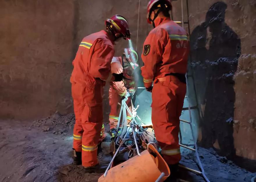 到場后發(fā)現(xiàn)事故庫井口只能容納1人通過,情況危急、作業(yè)難度大,中隊指揮員立即組織實施救援,做好安全措施后,指揮員帶領(lǐng)3人攜帶救生裝備順救生軟梯下庫井進行偵查實施救援,偵查后發(fā)現(xiàn)庫井內(nèi)部空間有一塊3平方米左右的作業(yè)平臺,底部呈錐形,深度約8米,1名被困人員趴于庫井底部最下方。救援人員對被困人員進行呼喊,發(fā)現(xiàn)被困人員只有微弱的意識,救援人員順救生軟梯深入到庫井底部進行救援,到達底部后對被困人員的身體進行檢查,發(fā)現(xiàn)被困人員頸部受傷,其他部位有輕微擦傷,救援人員將其頸部固定好后合力將被困人員固定于多功能擔(dān)架上,經(jīng)過40多分鐘的緊張救援,被困人員被成功救出,目前已被120救護車送往醫(yī)院進行進一步治療。
