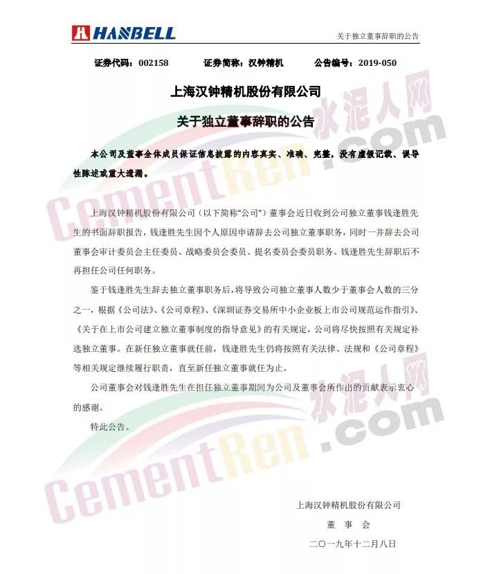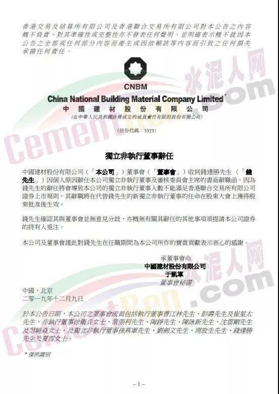 中國(guó)建材則公告表示,錢逢勝因個(gè)人原因辭任公司獨(dú)立非執(zhí)行董事及審核委員會(huì)主席的書面辭職函。