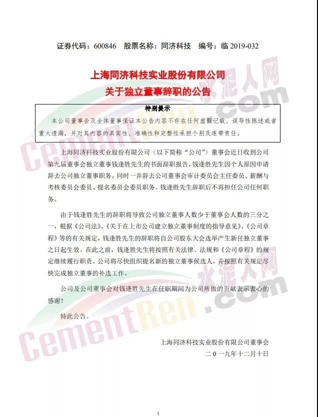 同濟(jì)科技公告稱,錢逢勝因個(gè)人原因申請(qǐng)辭去公司獨(dú)立董事職務(wù),同時(shí)一并辭去公司董事會(huì)審計(jì)委員會(huì)主任委員、薪酬與考核委員會(huì)委員、提名委員會(huì)委員職務(wù)。錢逢勝先生辭職后不再擔(dān)任公司任何職務(wù)。