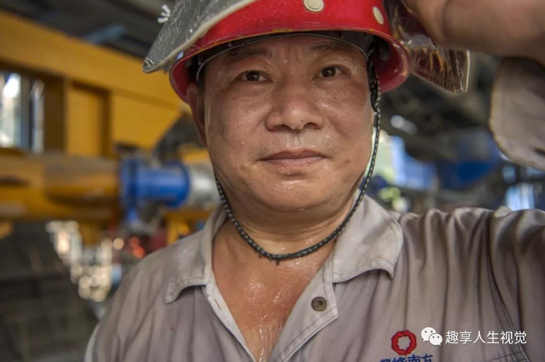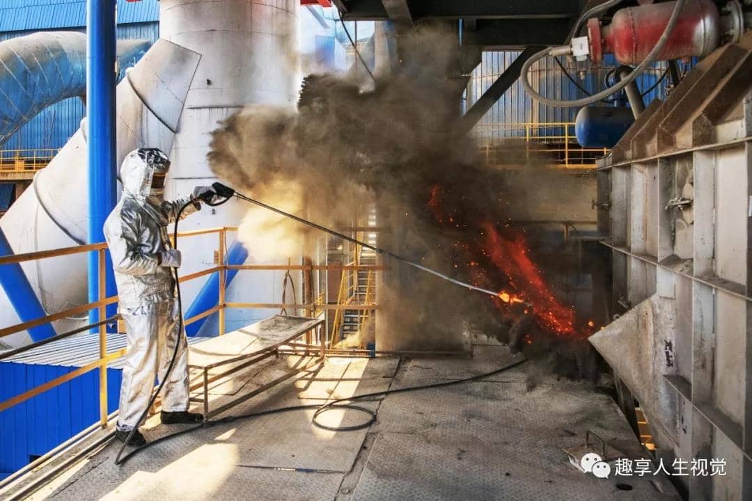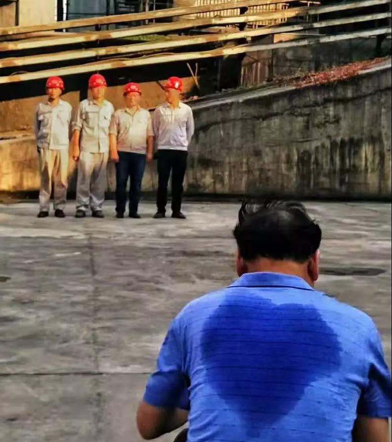 2019年8月23日常德南方水泥,預(yù)熱巡檢工姜業(yè)華在2000度高溫回轉(zhuǎn)窯的窯頭檢測窯溫。