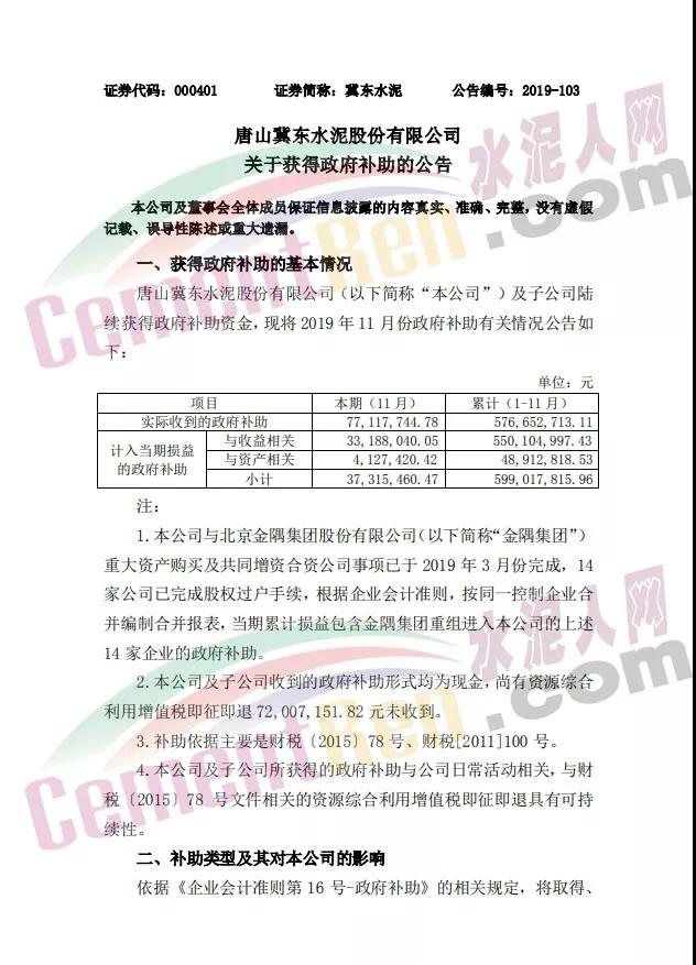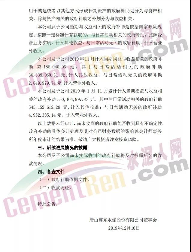 冀東水泥及子公司收到的政府補(bǔ)助形式均為現(xiàn)金,尚有資源綜合利用增值稅即征即退 7200.72萬(wàn)元未收到。公司及子公司2019 年11月計(jì)入當(dāng)期損益與收益相關(guān)的政府補(bǔ)助 3318.80萬(wàn)元 ,其中與日常活動(dòng)相關(guān)的政府補(bǔ)助3033.81萬(wàn)元,計(jì)入其他收益;與日?;顒?dòng)無(wú)關(guān)的政府補(bǔ)助 285萬(wàn)元,計(jì)入營(yíng)業(yè)外收入。