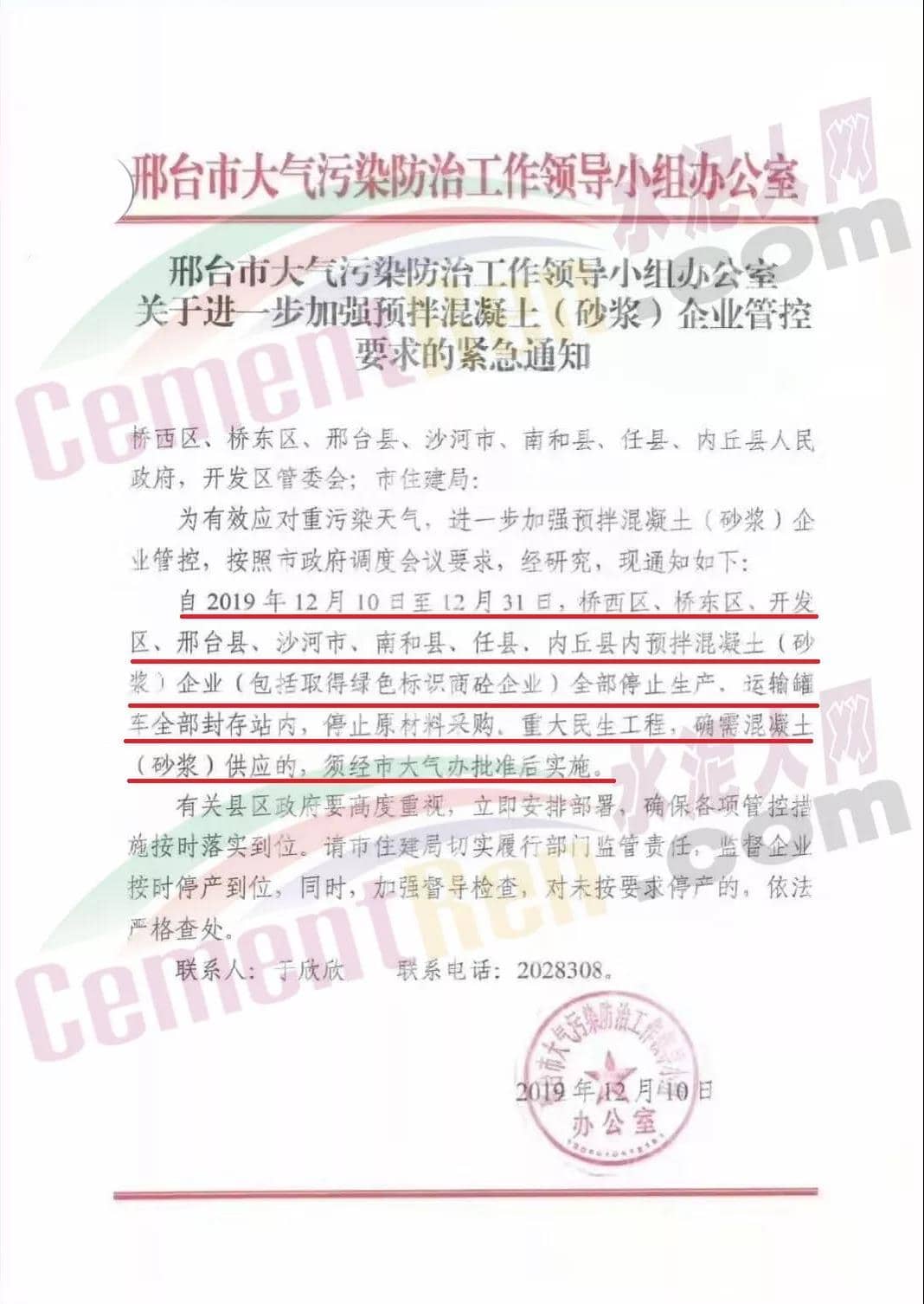 為有效應(yīng)對重污染天氣,進(jìn)一步加強(qiáng)預(yù)拌混凝土(砂漿)企業(yè)管控,按照市政府調(diào)度會(huì)議要求,決定自2019年12月10日至12月31日,橋西區(qū)、橋東區(qū)、開發(fā)區(qū)、邢臺縣、沙河市、南和縣、任縣、內(nèi)丘縣內(nèi)預(yù)拌混凝土企業(yè)全部停止生產(chǎn),運(yùn)輸罐車全部封存站內(nèi),停止原材料采購,重大民生工程,確需混凝土供應(yīng)的,必須經(jīng)市大氣辦批準(zhǔn)后實(shí)施。