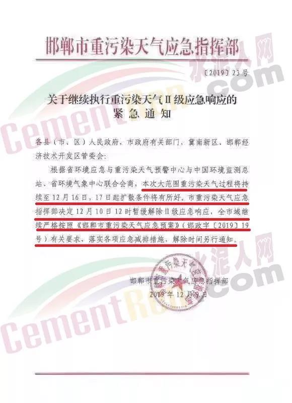 9日,河北省邯鄲市重污染天氣應(yīng)急指揮部也發(fā)布了《關(guān)于繼續(xù)執(zhí)行重污染天氣二級應(yīng)急響應(yīng)的緊急通知》稱,根據(jù)省環(huán)境應(yīng)急于重污染天氣預(yù)警中心與中國環(huán)境監(jiān)測總站,省環(huán)境氣象臺中心聯(lián)合會(huì)商,本次大范圍重污染天氣過程將持續(xù)至12月16日,17日起擴(kuò)散條件將有所好。邯鄲市重污染天氣應(yīng)急指揮部決定12月10日12時(shí)暫緩解除二級應(yīng)急響應(yīng),全市域繼續(xù)嚴(yán)格按照《邯鄲市重污染天氣應(yīng)急預(yù)案》(邯政字【2019】19號)有關(guān)要求,落實(shí)各項(xiàng)應(yīng)急減排措施,解除時(shí)間另行通知。