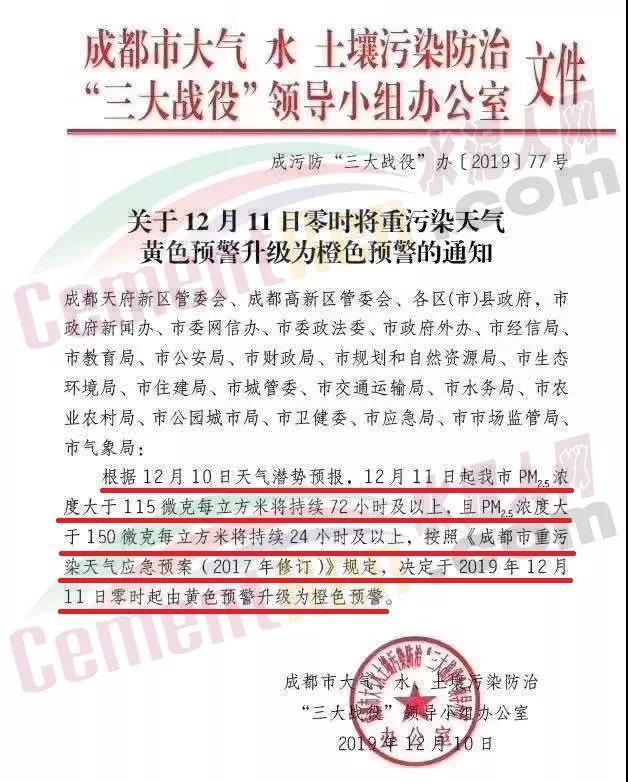 12月10日,四川省成都市大氣、水、土壤污染防治“三大戰(zhàn)役”領(lǐng)導(dǎo)小組辦公室發(fā)布了《關(guān)于12月11日零時(shí)將重污染天氣黃色預(yù)警升級為橙色預(yù)警的通知》稱,根據(jù)12月10日天氣潛勢預(yù)報(bào),12月11日起成都市PM2.5濃度大于115微克每立方將持續(xù)72小時(shí)及以上,且PM2.5濃度大于150微克每立方將持續(xù)24小時(shí)及以上,按照《成都市重污染天氣應(yīng)急預(yù)案(2017年修訂)》規(guī)定,決定于2019年12月11日零時(shí)起由黃色預(yù)警升級為橙色預(yù)警。