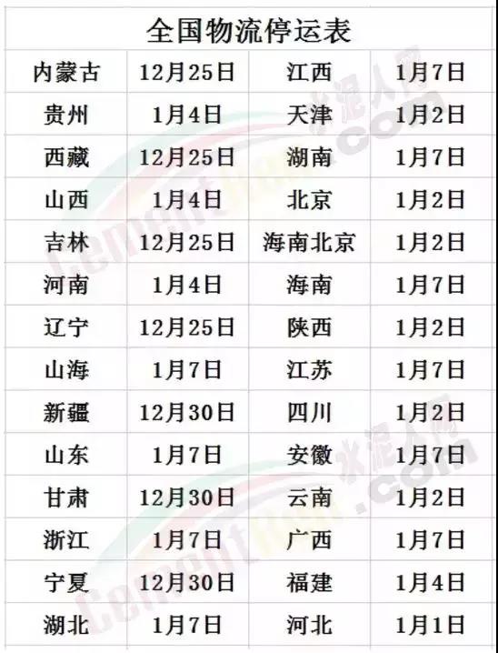 時(shí)至年底,隨著天氣寒冷和最近霧霾天氣嚴(yán)重,物流部發(fā)出聲明,全國物流停運(yùn)時(shí)間已經(jīng)確定:內(nèi)蒙古、西藏、吉林、遼寧等地12月25日停運(yùn);新疆、甘肅、寧夏等地12月30日停運(yùn);河北1月1日停運(yùn);天津、北京、陜西、四川、云南等地1月2日停運(yùn);福建、貴州、山西、河南等地1月4日停運(yùn);上海、山東、浙江、湖北、江西、湖南、海南、江蘇、安徽、廣西等地1月7日停運(yùn)。