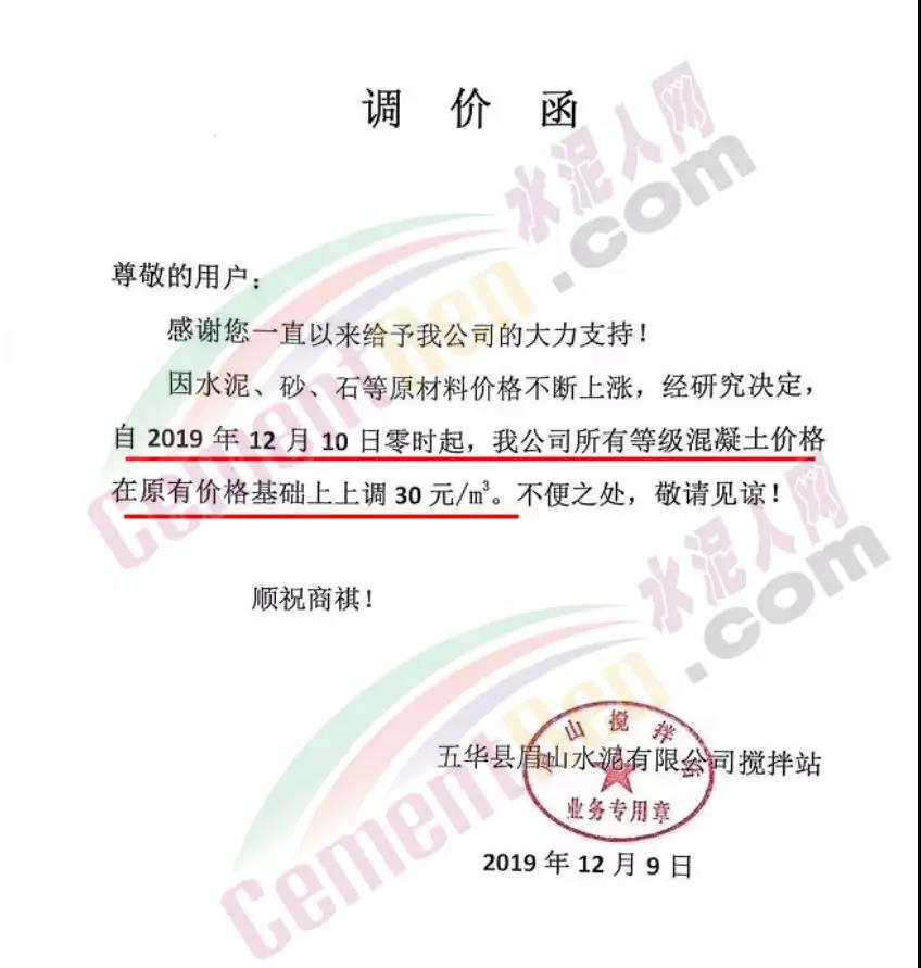 同期,因水泥、砂、石等原材料價(jià)格不斷上漲,經(jīng)研究決定 自12月10日零時(shí)起,公司所有等級(jí)混凝土價(jià)格在原有價(jià)格基礎(chǔ)上上調(diào)30元/方。