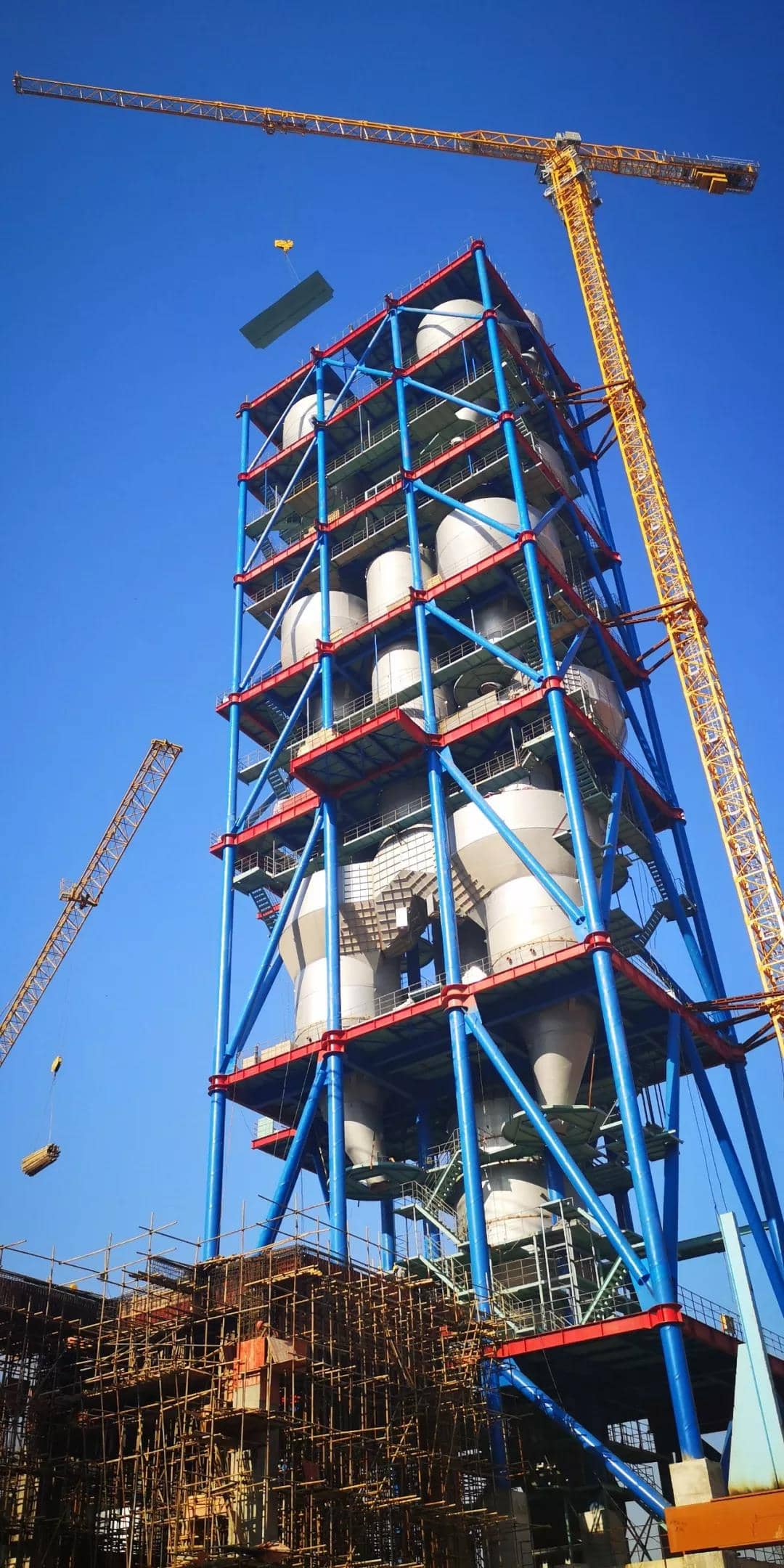 回轉窯窯尾是項目建設中的最高建筑,主要包括預熱器、分解爐等大型設備,在整個工藝流程中擔負生料喂入旋風筒、循環(huán)預熱分解后入窯的重要作用。8月18日貴州尖峰項目的設備安裝“第一吊”,也是從窯尾開始的。