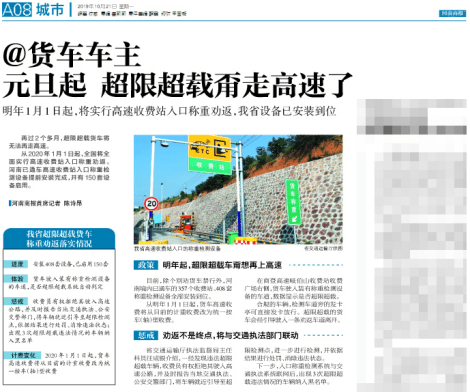 河南商報也發(fā)布了關(guān)于超限超載通知,明年1月1日起,將實行高速收費站入口稱重勸返,目前,除個別站貨車禁行外,河南境內(nèi)已通車的357個收費站、408套稱重檢測設備全部安裝到位。