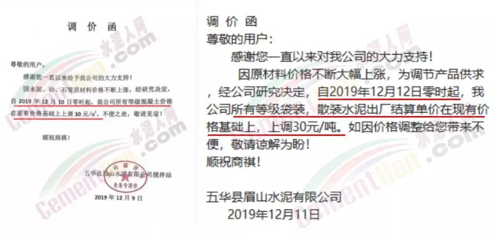 12月11日五華縣眉山水泥有限公司發(fā)調(diào)價(jià)函稱,因原材料價(jià)格不斷大幅上漲,為調(diào)節(jié)產(chǎn)品供求,經(jīng)公司研究決定,自2019年12月12日零時(shí)起,公司所有等級(jí)袋裝,散裝水泥出廠結(jié)算單價(jià)在現(xiàn)有價(jià)格基礎(chǔ)上,上調(diào)30元/噸。